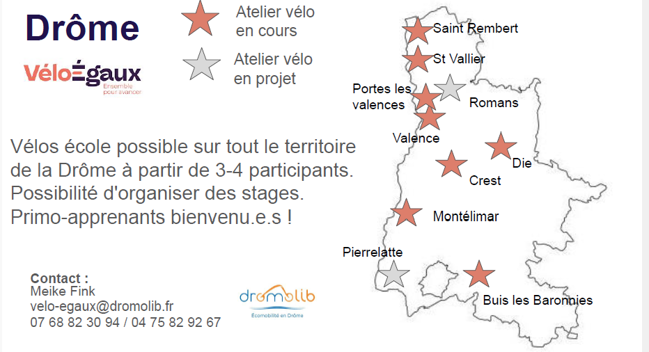 - aux partenaires qui organisent des vélos écoles et des ateliers mécaniques un peu par tout dans la Drôme et l’Ardèche (liste des lieux en bas de cet article),