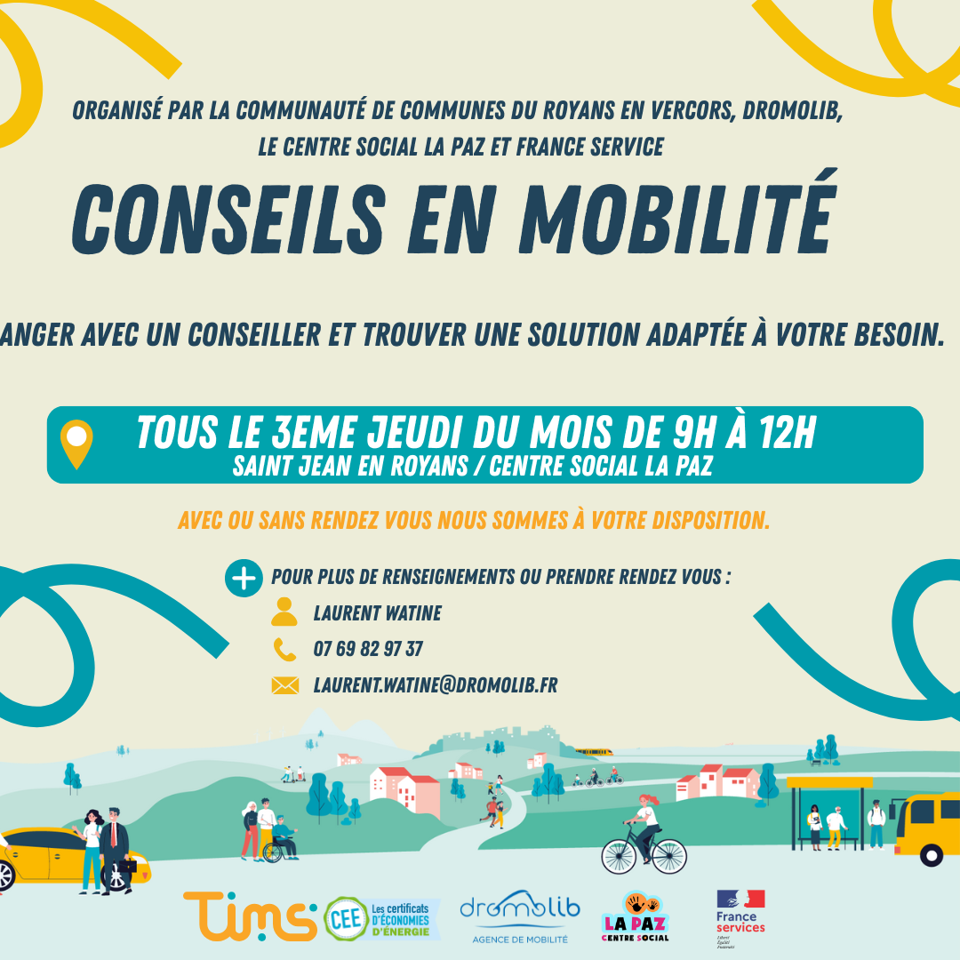 Vous avez des difficultés pour vous déplacer ou des questions sur les solutions de mobilité près de chez vous ? Un conseiller mobilité vous accueille pour échanger et vous aider à trouver une solution adaptée à votre situation. 📍 Lieu : Centre social La Paz, Saint-Jean-en-Royans 📆 Date : Les 3ème jeudi du mois ⏰ […]