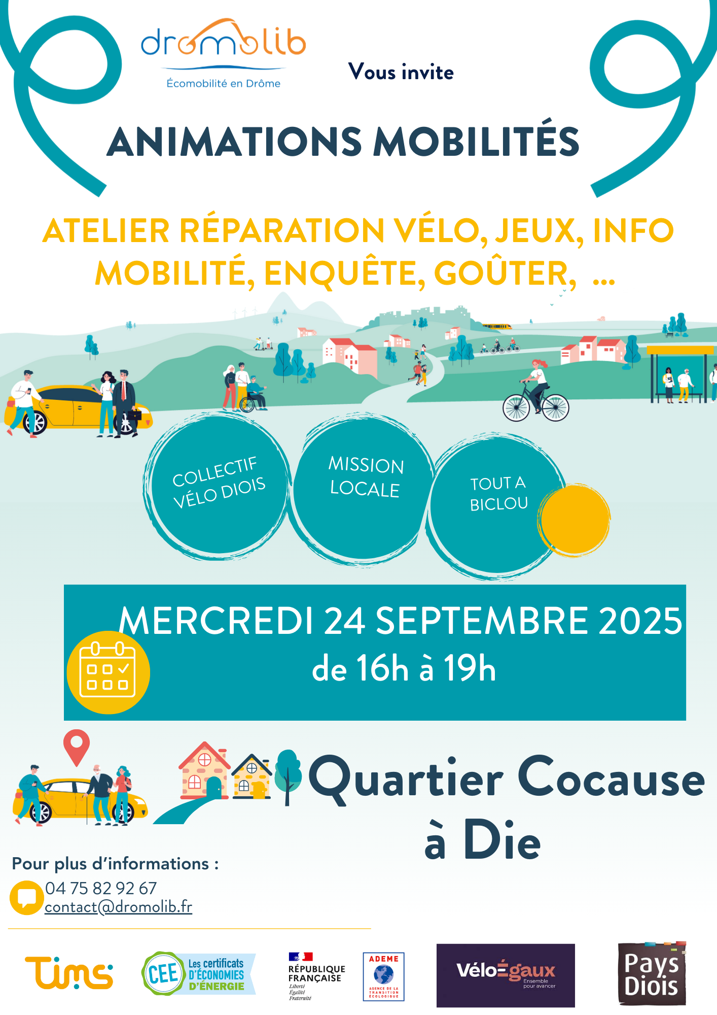 Le mercredi 24 septembre 2025, de 16h à 19h, venez participer à un après-midi autour de la mobilité durable à Cocause : atelier réparation vélo avec le Collectif Vélo Diois, jeux, infos pratiques, enquête échange autour d’un nouveau moyen de transport collectif des enfants à vélo avec Tout à Biclou et… un goûter.